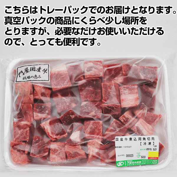 こちらの商品はお好きな発送形態が選べます →国産牛煮込み用角切り肉500g(真空パック) →国産牛煮込み用角切り肉500g(トレーパック) 【特徴(真空パック)】 真空パックはトレーパックにくらべ、約半分のスペースで収納出来ます。