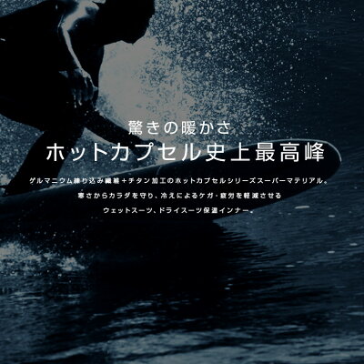 ホットカプセルシリーズ ホットカプセル ゲルマテックチタン ゲルマニウム 日本製 防寒 保温 蓄熱 温熱 チタン ゲルマニウム 温熱 血行促進 保温 蓄熱効果 特殊気密起毛加工 特殊チタンコーティング ウェットスーツインナー ドライスーツインナー ダイビングインナー ストレッチ フィット 冷え予防 冷え対策 ケガ対策 ケガ 寒さ対策 寒さ予防 疲労軽減 サーフィン ダイビング ウィンタースポーツ スキューバダイビング スクーバダイビング フィッシング ヨット 沢登り 釣り フィッシング マリンスポーツ ウォータースポーツ アウトドア フェス ヨガ スキー スノボ スノーボード バイク 自転車 ジム トレーニング 通勤 通学商品説明 ゲルマニウム練り込み繊維+チタン加工のホットカプセルシリーズスーパーマテリアル! 寒さからカラダを守り、冷えによるケガ・疲労を軽減させるウェットスーツ、ドライスーツ保温インナーです。